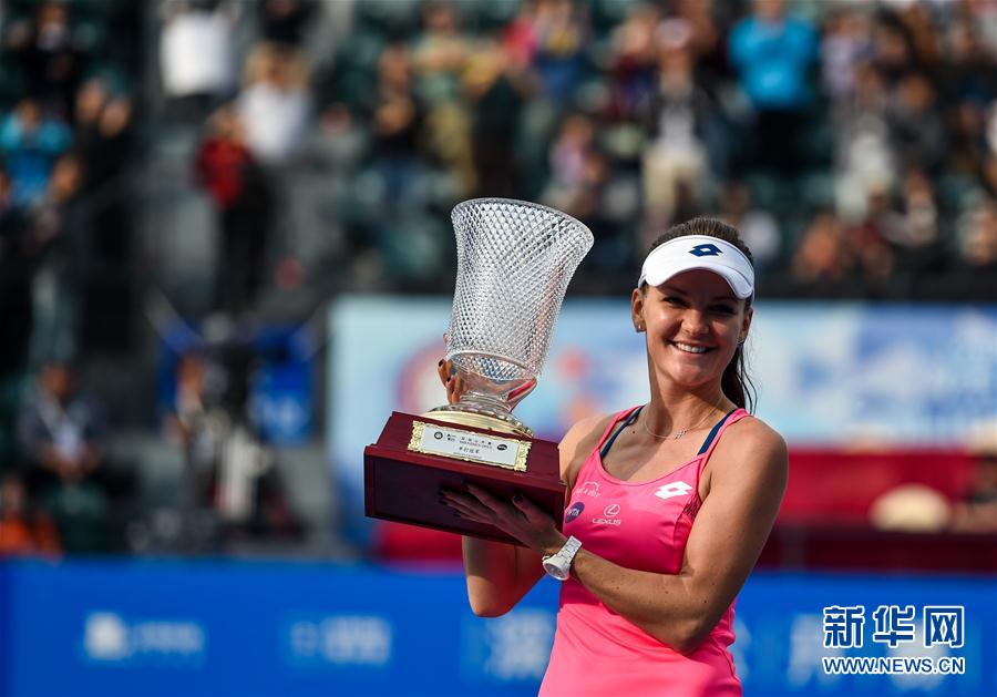 2016年1月9日,波兰选手拉德万斯卡在WTA深圳公开赛女单决赛颁奖仪式上展示冠军奖杯。 新华社记者毛思倩摄