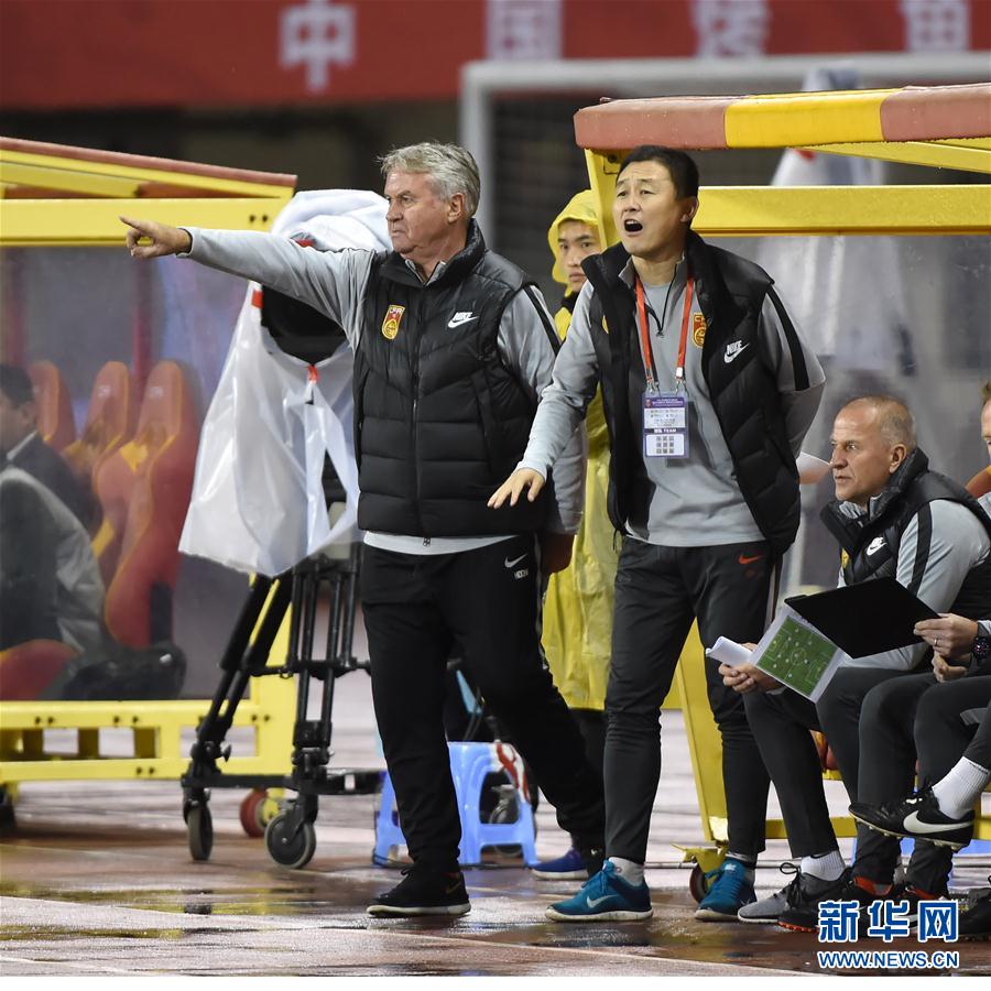11月15日,中国U21男子足球队主教练希丁克(左一)和中方教练组长孙继海(左二)在场边指挥。 新华社记者唐奕摄