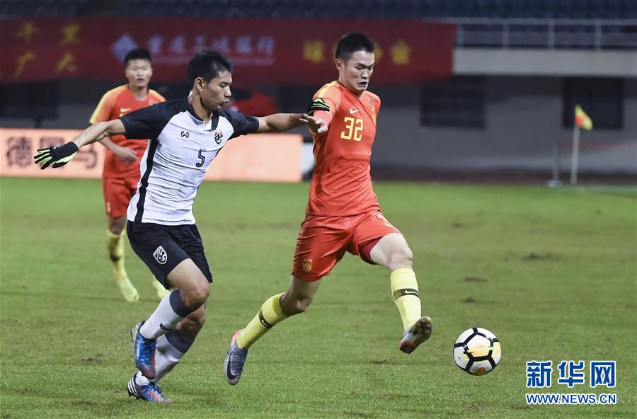 11月15日,中国队球员尹聪耀(右)与泰国队球员奥克索恩斯里在比赛中拼抢。 新华社记者唐奕摄