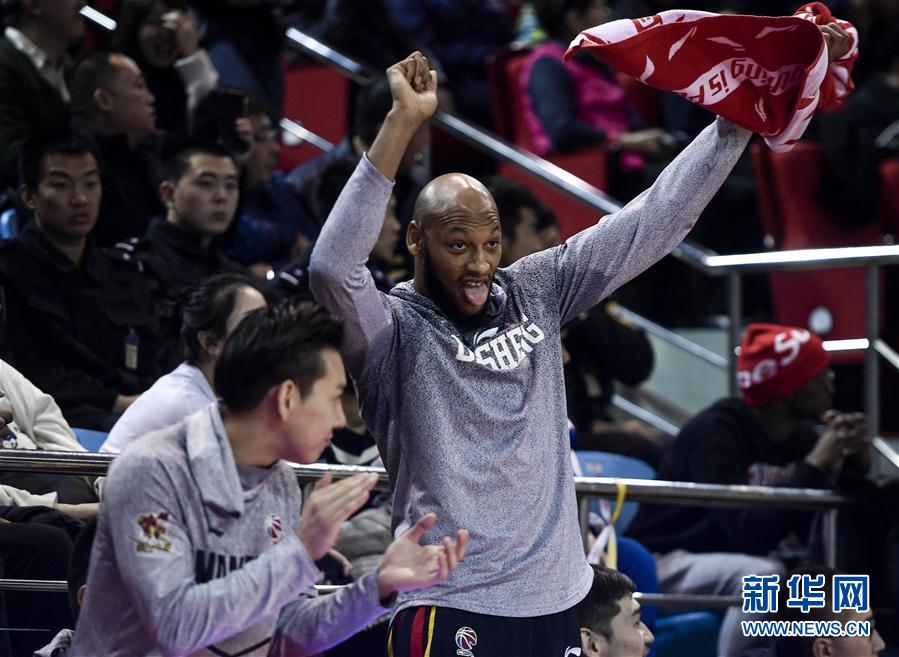 11月15日,南京同曦大圣队球员佩恩(右)在为场上队友加油。 新华社记者许畅摄