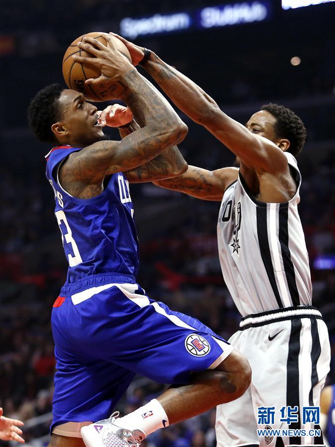 11月15日,快船队球员路易斯·威廉姆斯(左)在比赛中进攻受阻。 当日,在2018-2019赛季NBA常规赛中,洛杉矶快船队主场以116比111战胜圣安东尼奥马刺队。 新华社发(赵汉荣摄)