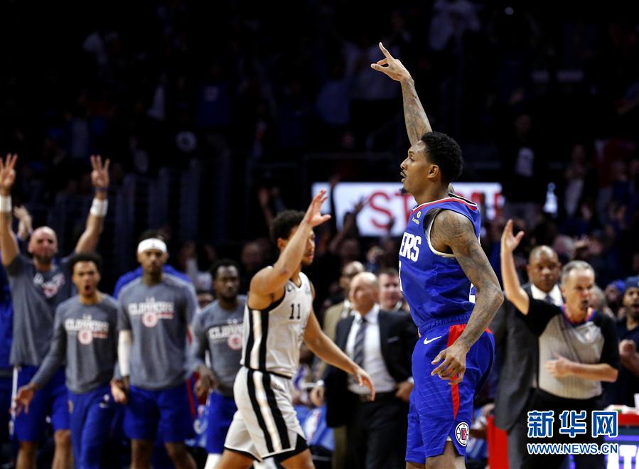 11月15日,快船队球员路易斯·威廉姆斯(前右)在比赛中庆祝得分。 新华社发(赵汉荣摄)