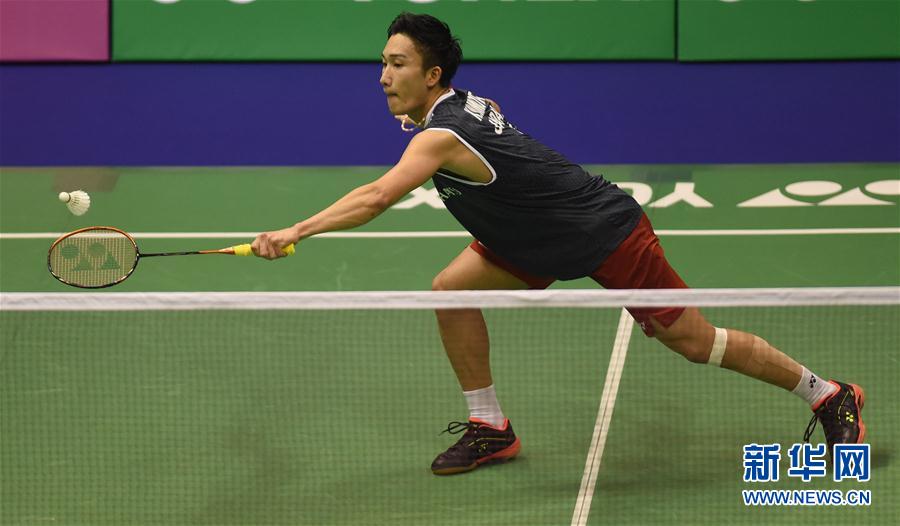 11月16日,日本选手桃田贤斗在比赛中回球。 当日,在2018年香港羽毛球公开赛男单四分之一决赛中,日本选手桃田贤斗以2比1战胜印尼选手约纳坦·克里斯蒂,晋级半决赛。 新华社记者卢炳辉摄