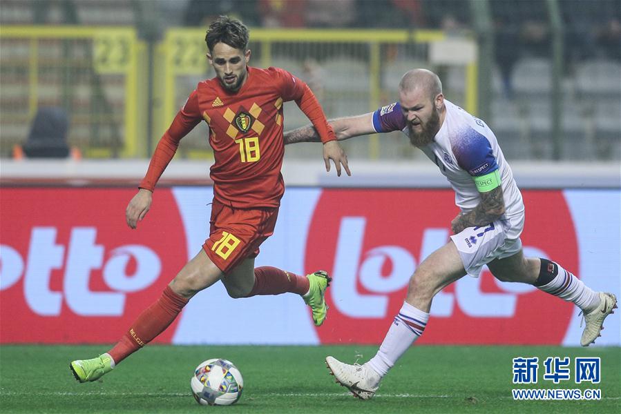11月15日,比利时队球员贾努扎伊(左)与冰岛队球员贡纳松在比赛中拼抢。 当日,在比利时布鲁塞尔进行的欧洲国家足球联赛A级第2组的比赛中,比利时队主场以2比0战胜冰岛队。 新华社记者郑焕松摄