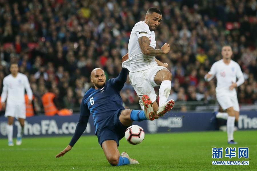 11月15日,英格兰队球员威尔逊(前右)在比赛中射门得分。 当日,在英国伦敦进行的一场国际足球友谊赛中,英格兰队以3比0战胜美国队。 新华社发(蒂姆·爱尔兰摄)