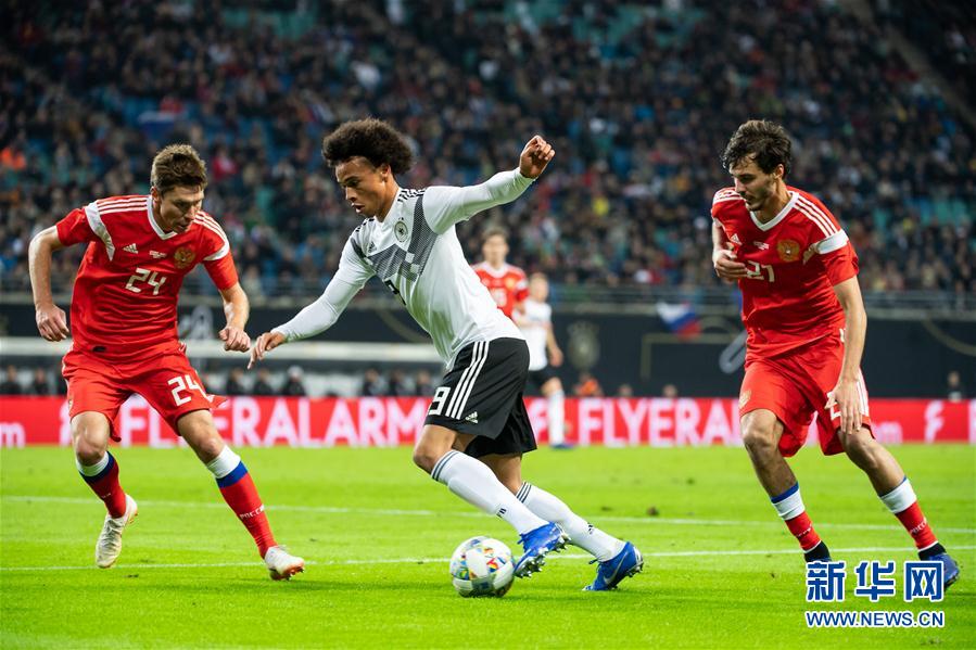 11月15日,德国队球员萨内(中)在比赛中带球突破。 当日,在德国莱比锡进行的一场国际足球友谊赛中,德国队以3比0战胜俄罗斯队。 新华社发(凯文·福格特摄)