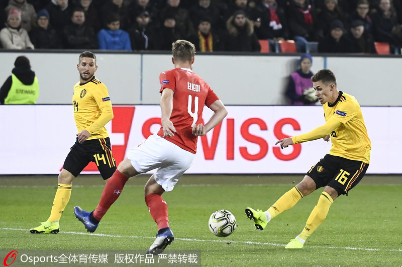 第67分钟,阿扎尔接巴舒压伊传球后起脚远射,瑞士门将佐默将球扑出。