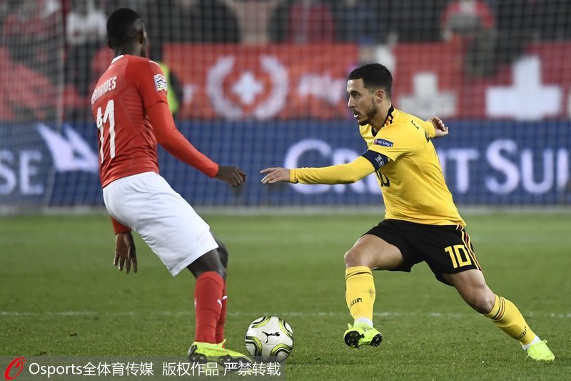 第67分钟,阿扎尔接巴舒压伊传球后起脚远射,瑞士门将佐默将球扑出。