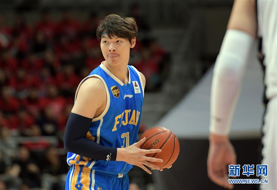 福建晋江文旅队球员王哲林(左)在比赛中。 新华社记者杨青摄