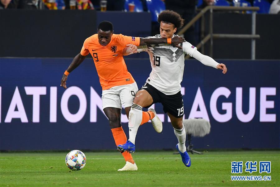 11月19日,德国队球员萨内(右)与荷兰队球员普罗梅斯拼抢。新华社发(乌尔里希·胡夫纳格尔摄)