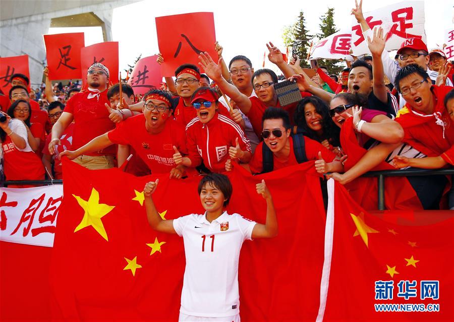 图为2015年6月20日,中国队球员王霜(下)在加拿大埃德蒙顿英联邦体育场举行的2015女足世界杯赛八分之一决赛对阵喀麦隆队的比赛后与球迷庆祝胜利。新华社记者丁旭摄