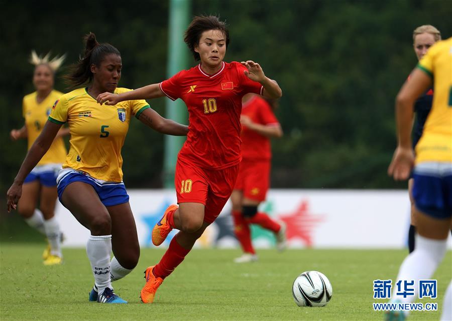 图为2015年7月6日,中国队球员王霜(右)在2015世界大学生运动会女子足球小组赛对阵巴西队的比赛中争抢。新华社记者廖宇杰摄