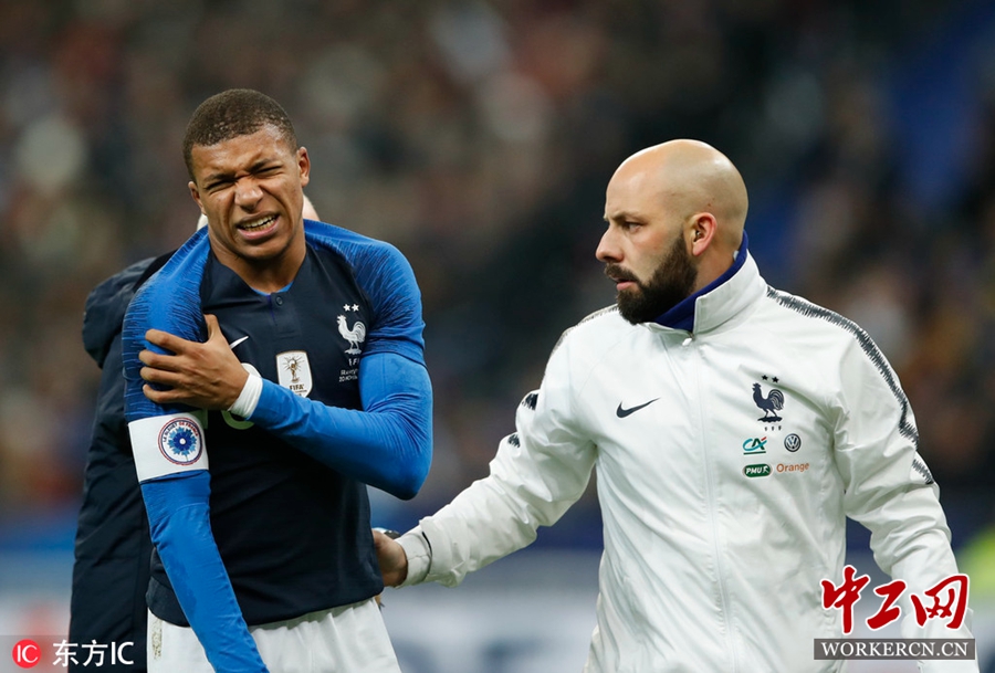 当地时间2018年11月20日,法国巴黎,2018国际足球友谊赛,法国1-0乌拉圭。姆巴佩受伤 图片来源:东方IC