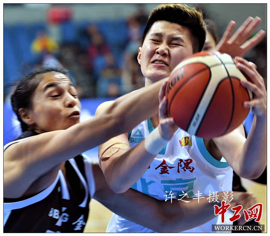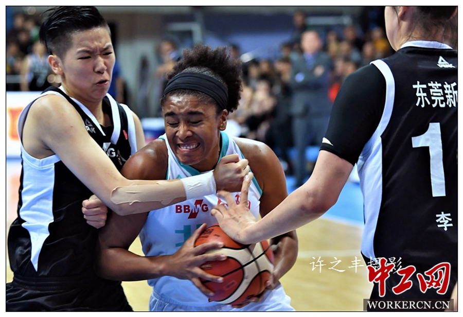 2018年11月21日晚,北京首钢篮球中心,北京首钢女篮主场以85比89负于广东东莞女篮,首钢遭遇联赛第四场败仗。东莞女篮拥有国家队主力中锋李月汝,本场比赛她赢得38分。东莞创下13连胜,打破了WCBA联赛最长连胜纪录。工人日报-中工网记者许之丰摄影报道