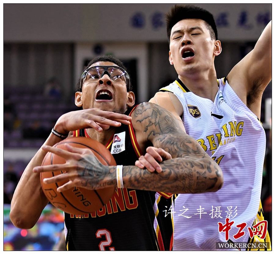 2018年11月22日晚,CBA第15轮比赛。北京北控农商行队主场以110比117负于南京同曦队,同曦队收获3连胜,同时北控队五连败。图为双方的比赛瞬间。