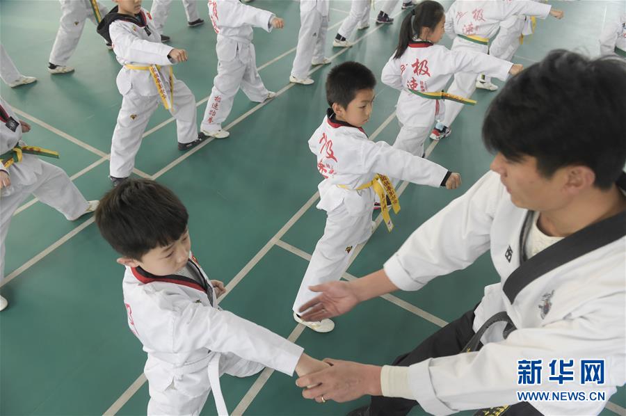 11月23日,在安次区辖区内的廊坊市第十四小学体育馆,学生们在校外教练的指导下练习跆拳道动作。 近年来,河北省廊坊市安次区积极推进素质教育,把全民健身理念融入体育教学,积极组织辖区内的社会体育培训团体走进中小学校,免费开展特色体育公益课,丰富学生们的健身内容,增强全民健身意识。 新华社记者鲁鹏摄