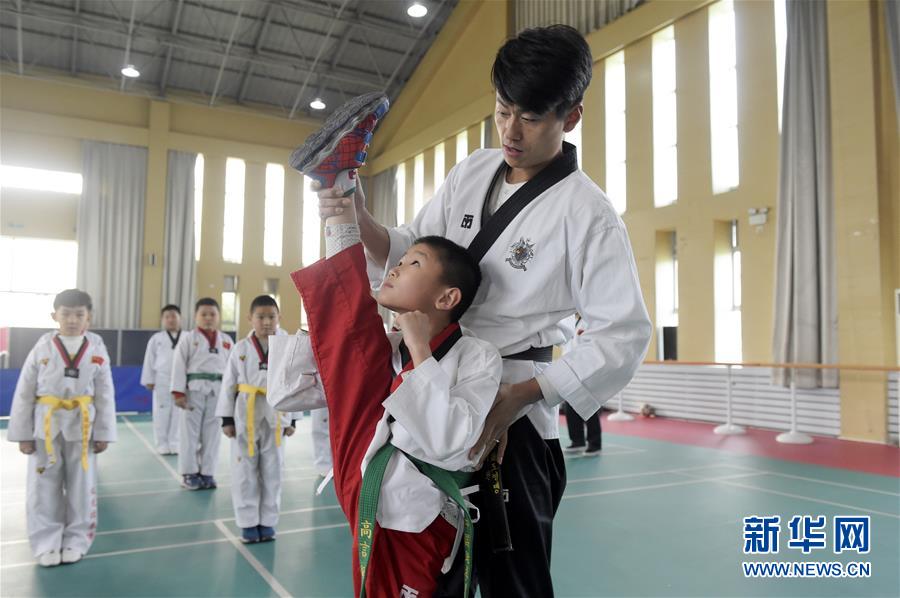 11月23日,在安次区辖区内的廊坊市第十四小学体育馆,一名校外教练(前右)指导学生练习跆拳道基本功动作。 近年来,河北省廊坊市安次区积极推进素质教育,把全民健身理念融入体育教学,积极组织辖区内的社会体育培训团体走进中小学校,免费开展特色体育公益课,丰富学生们的健身内容,增强全民健身意识。 新华社记者鲁鹏摄