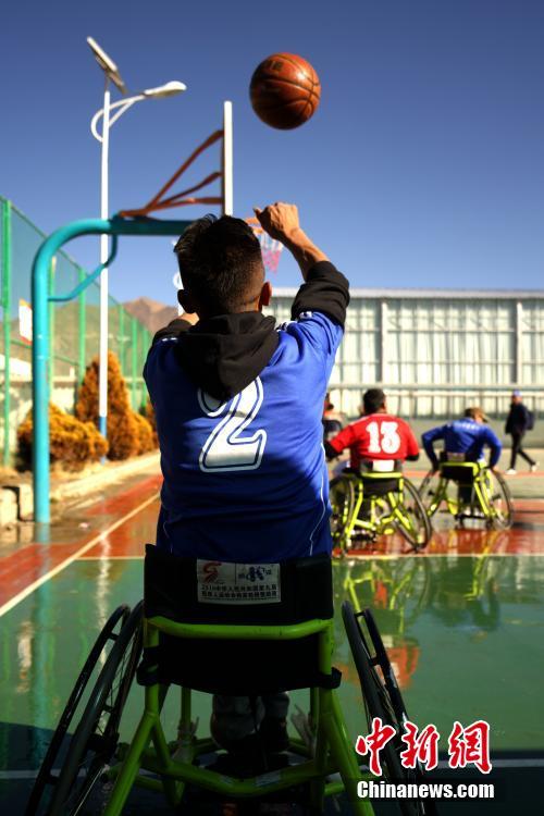 西藏拉萨有一支成立4年多的轮椅篮球队,队员中年龄最大的57岁,最小的20岁,该轮椅篮球队几乎每周日都会在海拔3650米的拉萨户外篮球场进行比赛。图为11月25日傍晚,比赛时蓝队队员旦增投射3分球。中新社记者 江飞波 摄