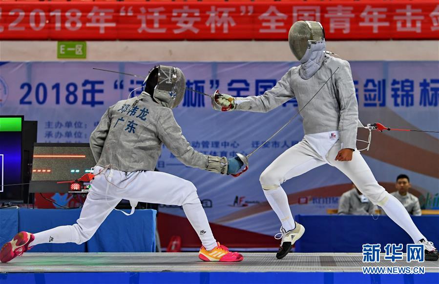 11月25日,广东队选手邓伟龙(左)与江苏队选手沈晨鹏在第二阶段男子佩剑团体赛决赛中。 当日,2018年“迁安杯”全国青年击剑锦标赛在河北省迁安市落幕。广东队在第二阶段男子佩剑团体赛决赛比赛中以45比40战胜江苏队,夺得冠军。 新华社记者杨世尧摄