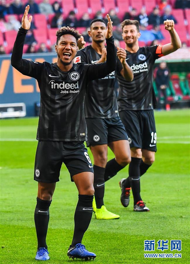 11月24日,法兰克福队球员德古兹曼(左一)在比赛中庆祝进球。 当日,在2018-2019赛季德国足球甲级联赛第12轮比赛中,法兰克福队客场以3比1战胜奥格斯堡队。 新华社发