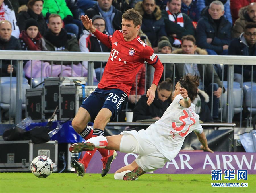 11月24日,拜仁慕尼黑队球员穆勒(上)与杜塞尔多夫队球员宇佐美贵史在比赛中拼抢。 当日,在2018-2019赛季德国足球甲级联赛第12轮比赛中,拜仁慕尼黑队主场以3比3战平杜塞尔多夫队。 新华社发