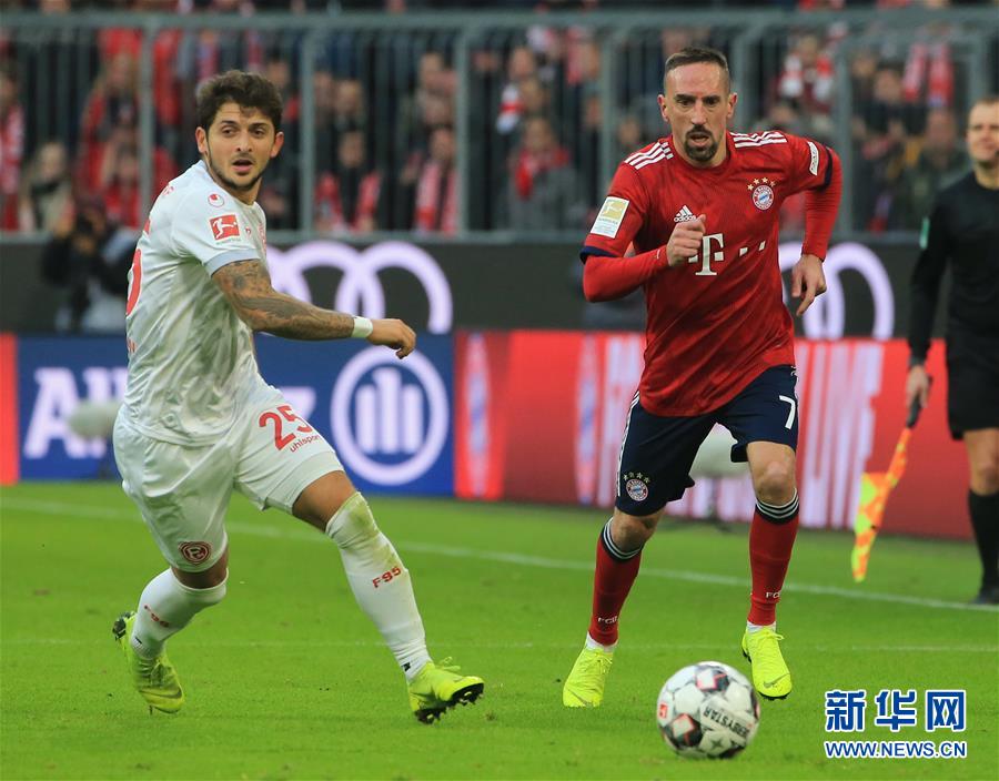 拜仁慕尼黑队球员里贝里(右)在比赛中带球突破。 新华社发