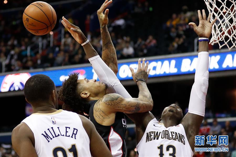 11月24日,鹈鹕队球员迪亚洛(右)在比赛中防守奇才队球员凯利·小乌布雷(中)的进攻。 当日,在2018-2019赛季NBA常规赛中,华盛顿奇才队主场以124比114战胜新奥尔良鹈鹕队。 新华社发