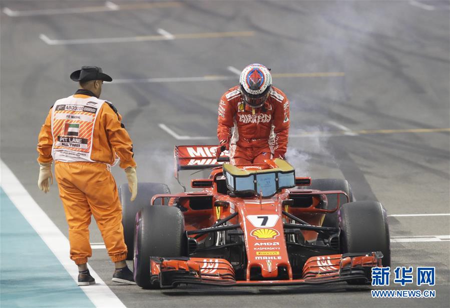 11月25日,法拉利车队车手莱科宁(右)在比赛中离开发生故障的赛车。 当日,2018赛季世界一级方程式赛车锦标赛(F1)最后一站比赛在阿联酋阿布扎比进行。法拉利车队芬兰车手莱科宁因赛车发生故障退赛。 新华社/美联