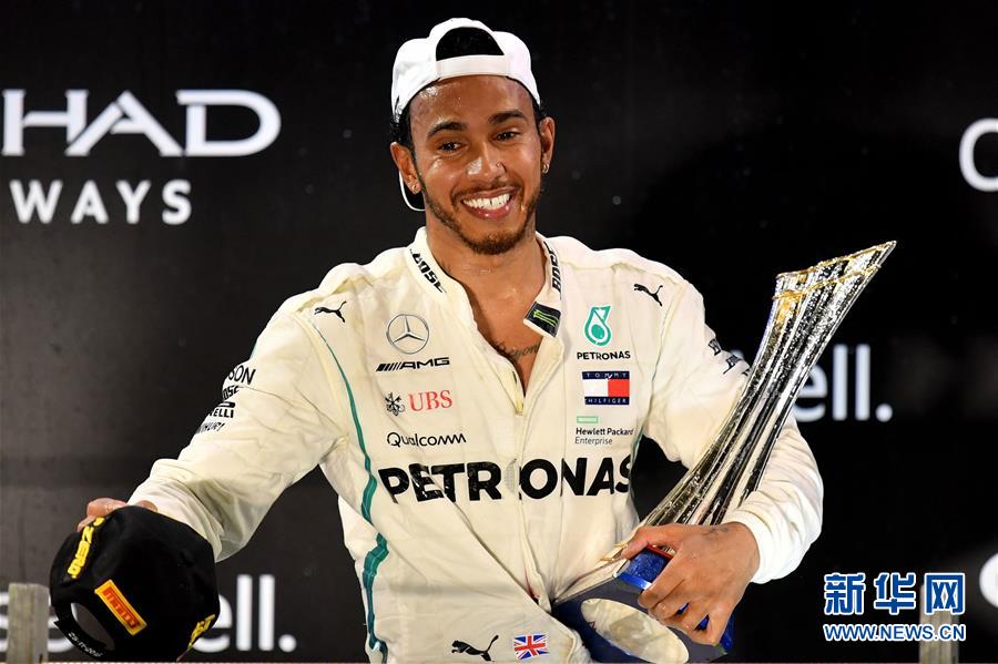 11月25日,汉密尔顿在领奖台上庆祝夺冠。 当日,2018赛季世界一级方程式赛车锦标赛(F1)最后一站比赛在阿联酋阿布扎比结束争夺,梅赛德斯车队英国车手汉密尔顿夺得冠军。 新华社/法新