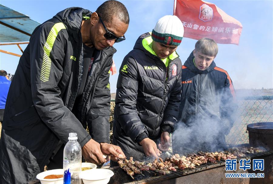 图为在新疆天山雪豹足球俱乐部的训练基地,维森特(左)和队员们一起烤羊肉串(11月5日摄)。 新华社记者王菲摄