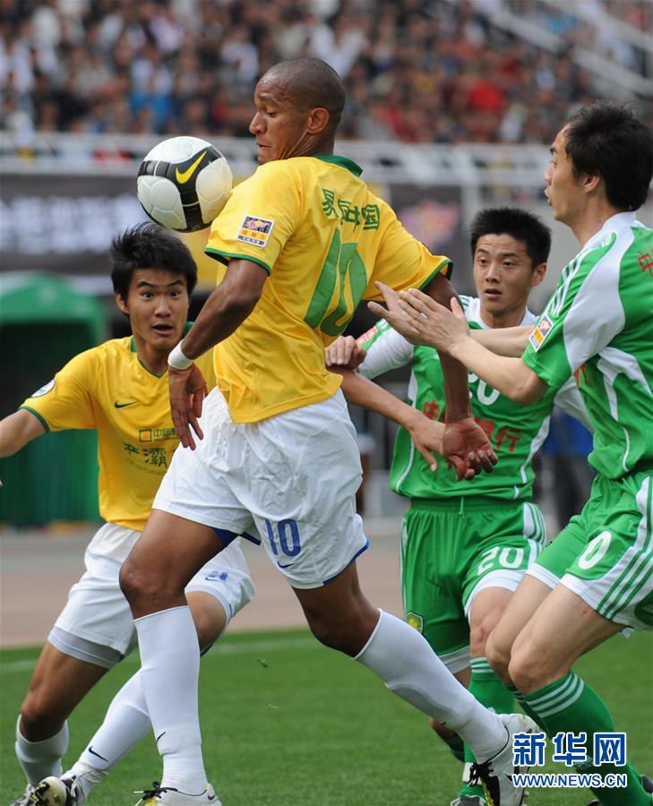 图为2009年4月26日,陕西中新队外援维森特(左二)在比赛中带球突破。当日,陕西中新队在2009中超联赛第6轮比赛中,主场以1比0战胜北京国安队。 新华社记者焦卫平摄