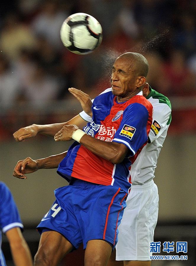 图为2010年8月14日,上海申花队球员维森特在比赛中争顶。当日,在中超联赛第18轮比赛中,杭州绿城队主场以1比1战平上海申花队。 新华社记者徐昱摄