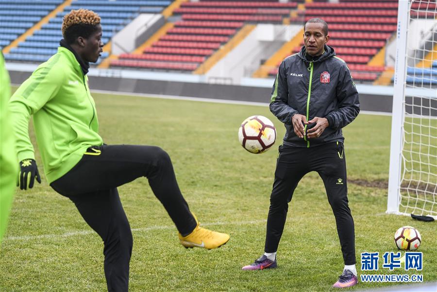 图为在位于乌鲁木齐的红山体育场内,维森特(右)在指导外援科比纳训练(11月1日摄)。 新华社记者王菲摄