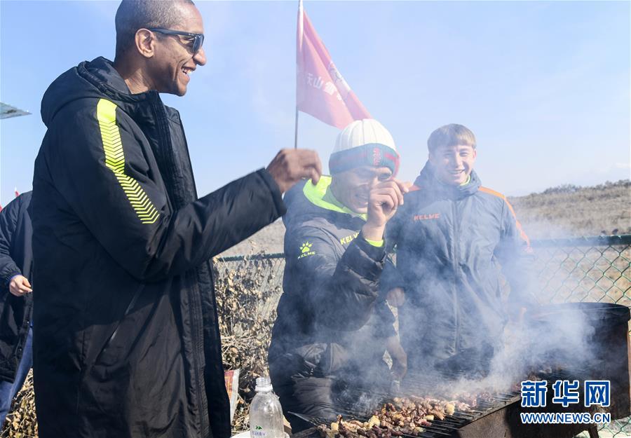 图为在新疆天山雪豹足球俱乐部的训练基地,维森特(左)和队员们一起烤羊肉串(11月5日摄)。 新华社记者王菲摄