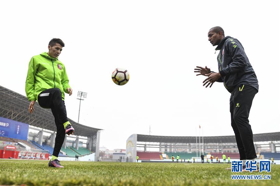 图为在位于乌鲁木齐的红山体育场内,维森特(右)在指导球员阿不都热合曼训练(11月1日摄)。 新华社记者王菲摄