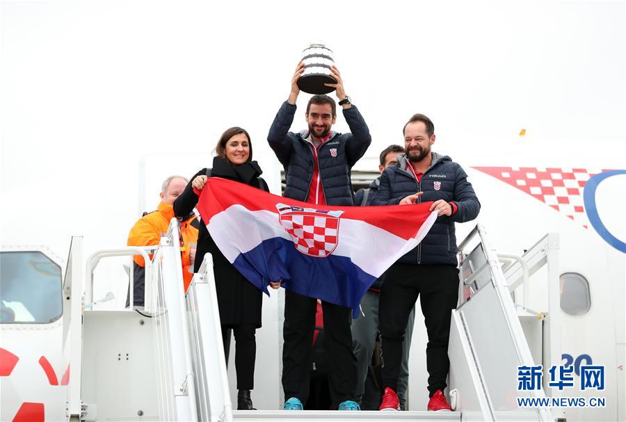 11月26日,克罗地亚队选手西里奇(中)在舷梯上展示冠军奖杯。 当日,克罗地亚网球队载誉回国并与球迷一同举行了庆祝活动。在刚刚落幕的2018年戴维斯杯网球团体赛世界组比赛中,克罗地亚队以3比1战胜法国队,夺得冠军。 新华社发