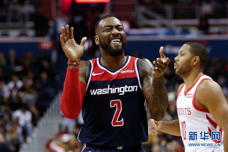 11月26日,奇才队球员沃尔(左)在比赛中庆祝。 当日,在2018-2019赛季NBA常规赛中,华盛顿奇才队主场以135比131战胜休斯敦火箭队。 新华社发