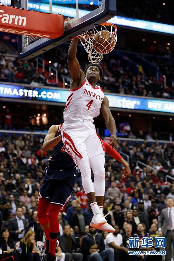 火箭队球员豪斯(前)在比赛中扣篮。 新华社发
