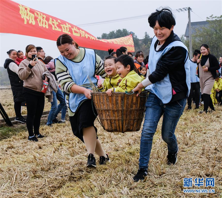 11月28日,孩子们和家长在稻田中参加趣味亲子游戏。 新华社记者 徐昱 摄