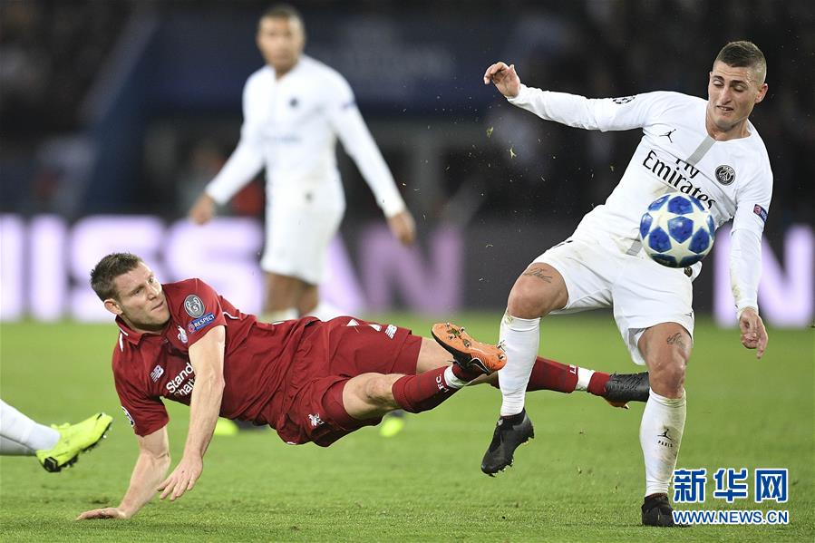 巴黎圣日耳曼队球员维拉蒂(右)与利物浦队球员米尔纳在比赛中拼抢。新华社发