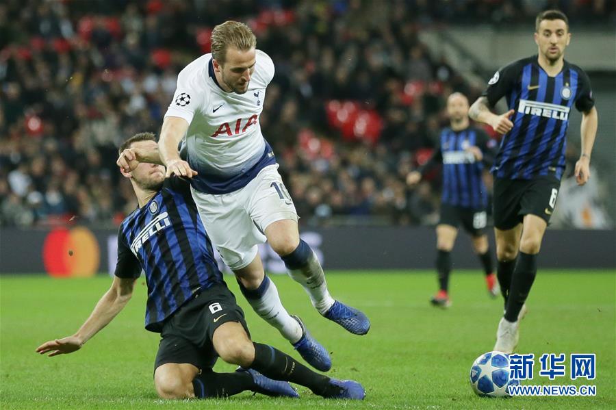 热刺队球员凯恩(中)与国际米兰队球员德弗里(左一)在比赛中拼抢。新华社发