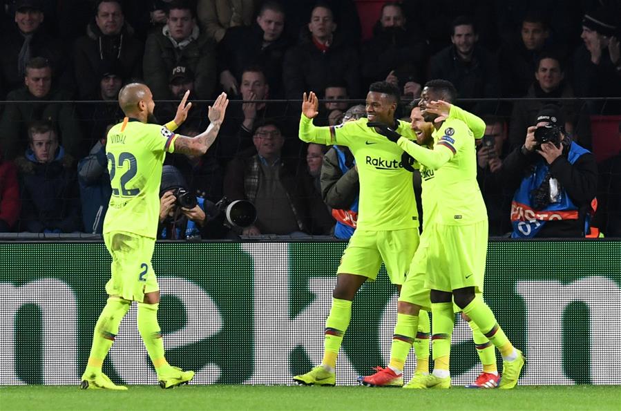 巴塞罗那队球员在比赛中庆祝进球。新华社/路透