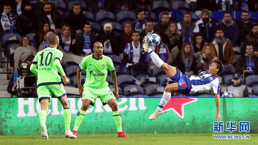 11月28日,波尔图队球员托雷斯(右)在比赛中倒钩射门。 当日,在2018-2019赛季欧冠联赛小组赛D组第五轮的比赛中,葡超波尔图队主场以3比1战胜德甲沙尔克04队。 新华社发