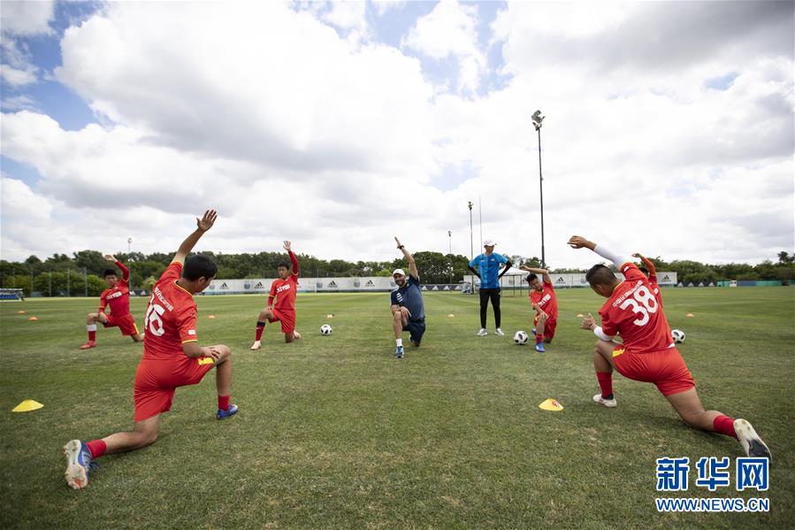 11月28日,在阿根廷布宜诺斯艾利斯的阿根廷国家足球训练基地,球员在训练赛前热身。 中阿足球合作计划“阿根廷国家足球训练基地体验活动”28日启动。来自北京体育大学中国足球运动学院的青少年足球运动员与教练员正式进驻阿根廷国家足球训练基地,在这里接受30天的高水平训练。 新华社记者李明摄