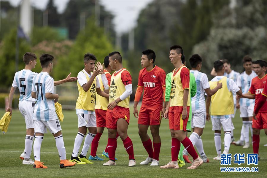 11月28日,在阿根廷布宜诺斯艾利斯的阿根廷国家足球训练基地,中阿球员在训练赛后互相致意。 中阿足球合作计划“阿根廷国家足球训练基地体验活动”28日启动。来自北京体育大学中国足球运动学院的青少年足球运动员与教练员正式进驻阿根廷国家足球训练基地,在这里接受30天的高水平训练。 新华社记者李明摄