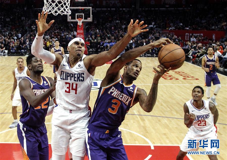 快船队球员托比亚斯·哈里斯(前中)与太阳队球员阿里扎 (前右) 在比赛中争抢篮板球。 新华社发
