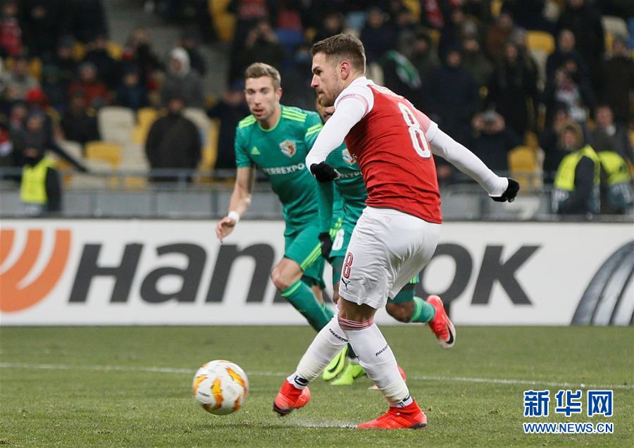 阿森纳队球员拉姆塞(前)在比赛中射门得分。 新华社/路透