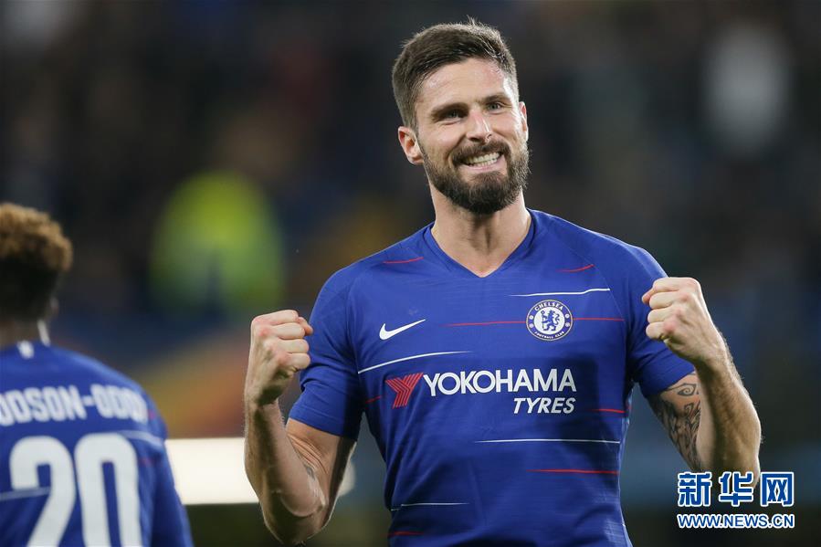 11月29日,切尔西队球员吉鲁在比赛中庆祝进球。 当日,在2018-2019赛季欧联杯L组比赛中,英超切尔西队主场以4比0战胜希超萨洛尼卡队。 新华社发