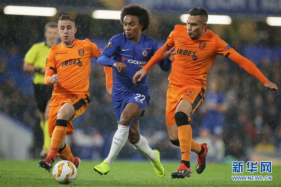 切尔西队球员威廉(前中)在比赛中带球突破。新华社发