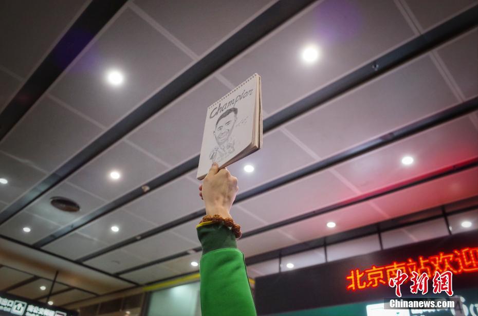 12月1日,北京国安俱乐部众将搭乘火车抵达北京南站,数千球迷到场迎接。11月30日,备受关注的足协杯“京鲁大战”落幕。北京中赫国安凭借总比分3:3,客场进球多一球的优势,战胜山东鲁能泰山,夺得2018中国足协杯冠军。图为球迷高举奥古斯托画像。 中新网记者 李霈韵 摄